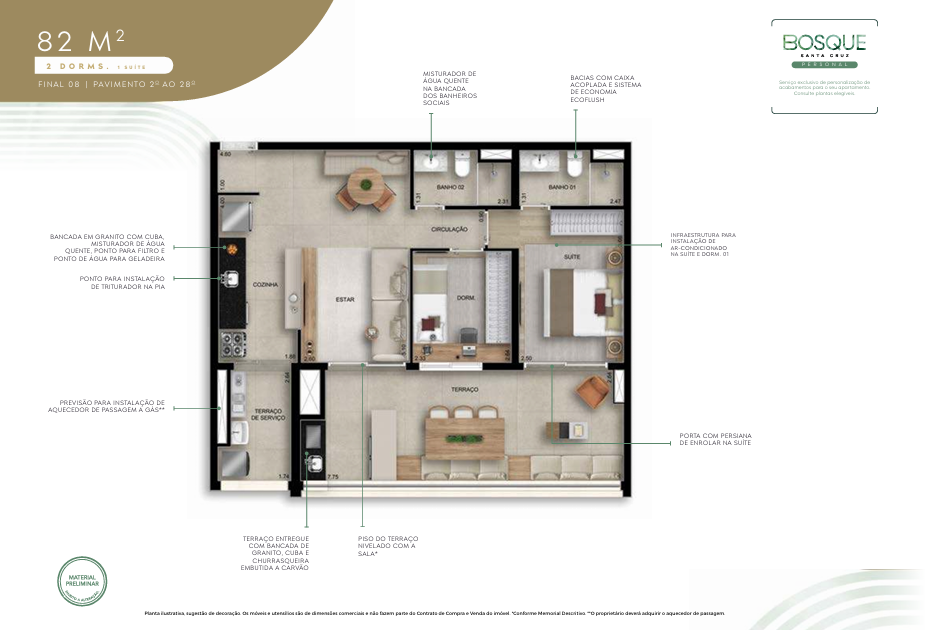 82 m²: 2 dormitórios (1 suíte), varanda gourmet, 1 vaga de garagem.