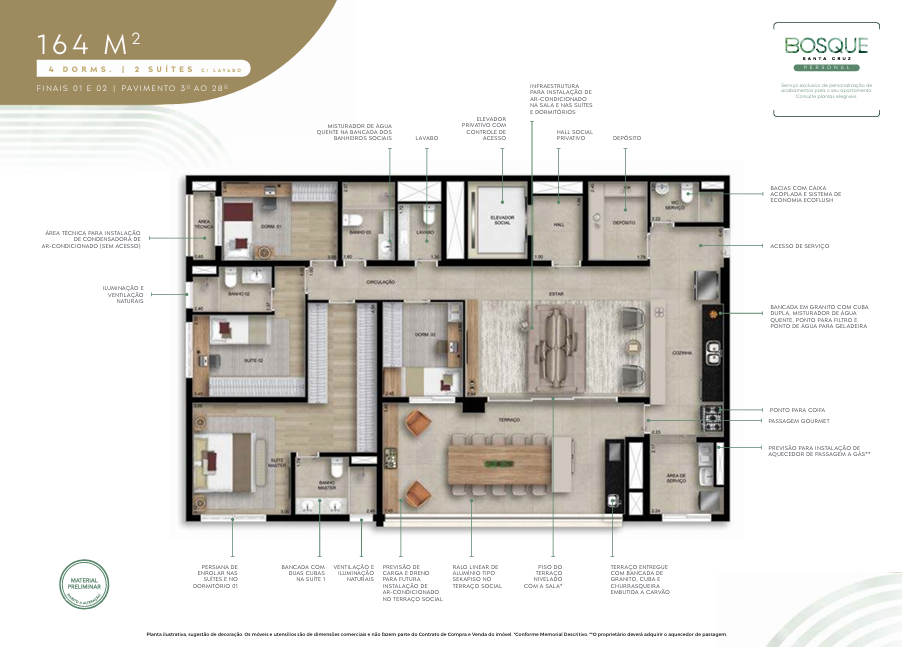 131 m²: 3 suítes, varanda gourmet, lavabo, depósito, 2 vagas de garagem.